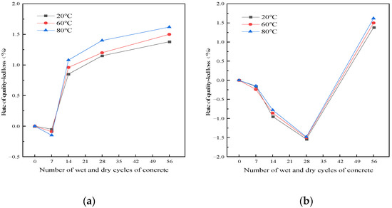 2 in the process of cement hydration in the early stage of the dry–wet cycle, which generates a large number of C-S-H gel to fill the holes and increase the quality. With the progress of the dry–wet cycle, water molecules are continuously immersed and baked inside the concrete, and the holes inside the concrete test block are increasing, even penetrating into cracks. The cementation force of the internal structure is weakened, and some internal particles are brought to the external environment, resulting in the continuous reduction in concrete quality. In the chloride salt solution, the mass of the specimen increased with the increase in the number of dry–wet cycles in the early stage of the dry–wet cycle, and the mass of the specimen reached the maximum peak at 28 dry–wet cycles. The reason is that the dry–wet cycle in the salt solution consists of the C-S-H gel produced by rice husk ash and Ca(OH)