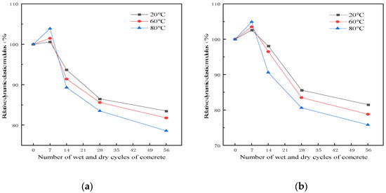 Figure 4 depicts the relationship between the relative dynamic elastic modulus and the number of dry–wet cycles of the RRFC specimens after different dry–wet cycles in aqueous solution and chloride solution at different temperatures.