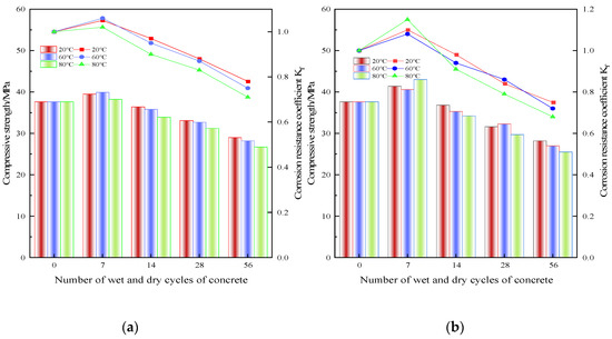 Figure 5 shows the curves of compressive strength and corrosion resistance coefficient of the RRFC specimens with the two solutions at different temperatures in the dry–wet cycle mechanism.