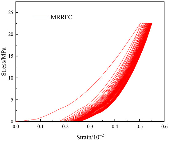 The cyclic loading and unloading test was carried out on the RRFC specimen after the dry–wet cycle, that is, 60% of the uniaxial compressive failure load of the specimen itself was taken as the upper limit of the loading load, and the lower limit of the unloading load was 100 N. A loading–unloading process was used as a cycle, and a total of 50 cycles was carried out. The test results are transformed into stress and strain by Formulas (1) and (2).