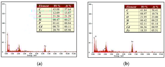 The EDS spectra of Fe3O4@SiO2@IIP before and after the adsorption of Cd(II) ions are shown in Figure 3. The presence of Fe and Si elements indicates the successful modification of Fe3O4 nanoparticles through the silica layer. The Cd changed significantly before and after the adsorption, with the content shifting from 0.75% (Wt%) to 6.36% (Wt%), confirming the adsorption properties of Fe3O4@SiO2@IIP.