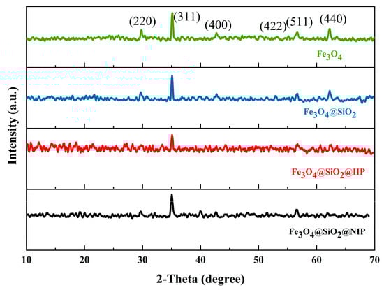 Phase identification was undertaken using XRD analysis. XRD patterns of the as-prepared Fe3O4, Fe3O4@SiO2, Fe3O4@SiO2@IIP, and Fe3O4@SiO2@NIP are shown in Figure 4. Compared with Fe3O4, Fe3O4@SiO2 showed the diffraction peaks of Fe3O4 at angles of 30.0°, 35.3°, 42.7°, 53.1°, 56.7°, and 62.3° corresponding to the (220), (311), (400), (422), (511), and (440) crystal planes of Fe3O4, respectively [,], which confirmed the successful compounding of Fe3O4 microspheres with SiO2. The XRD diffraction peaks of Fe3O4@SiO2@IIP and Fe3O4@SiO2@NIP were almost identical and became cluttered but, again, both retained the crystal plane of Fe3O4, verifying the successful introduction of Fe3O4 into the system of imprinted polymers. The detection of a characteristic peak at 35.3° confirmed the presence of high-crystalline Fe3O4 in the four samples.