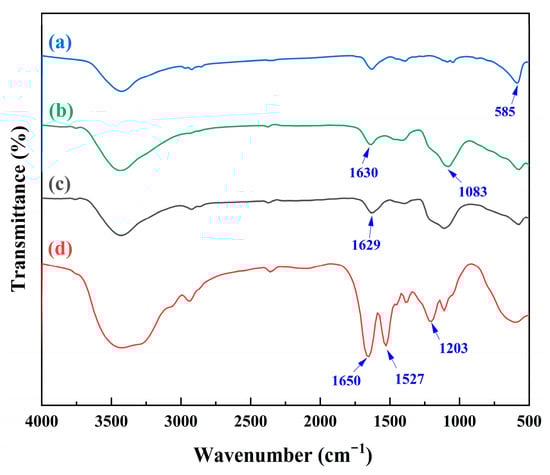 The FTIR maps of the samples were swept at 4000~400 cm−1 using the KBr infrared spectroscopy method to analyze the structures of the materials. Figure 6 shows the infrared spectra of Fe3O4 (a), Fe3O4@SiO2 (b), Fe3O4@SiO2@VTMOS (c), and Fe3O4@SiO2@IIP (d). A strong adsorption peak at 582 cm−1 (a) was observed for the stretching vibration of the Fe–O band in Fe3O4 magnetic nanoparticles []. The peaks for Fe-O at about 582 cm−1 in all the FTIR spectra (Figure 6a–d) confirmed the presence of Fe3O4 in all the nanospheres. After TEOS treatment of the Fe3O4, two peaks appeared at 1630 cm−1 and 1083 cm−1 (b). The former was due to the existence of O–H and the latter was the stretching vibration of Si–O, which verified that the Fe3O4 nanospheres were coated with SiO2 shells []. The peak at 1629 cm−1 (c) was caused by C=C stretching vibration. This proved that the double bond was successfully grafted onto the surface of Fe3O4@SiO2 [].