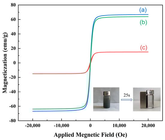 As shown in Figure 7, the hysteresis regression curves of the three materials had similar shapes and all passed through the origin, indicating their superparamagnetic nature and strong magnetic responsiveness to magnetic fields. This responsiveness is beneficial for magnetic separation purposes. The saturation magnetization intensity of Fe3O4 at room temperature was found to be 66.79 emu/g, while that of Fe3O4@SiO2 was reduced to 63.89 emu/g. The observed reduction in saturation magnetization intensity could be attributed to the presence of a SiO2 layer on the surface of the Fe3O4 nanoparticles. This layer resulted in a decrease in the mass fraction of the magnetic components. The saturation magnetization intensity of Fe3O4@SiO2@IIP was found to be significantly lower than that of bare Fe3O4 (15.02 emu/g). This reduction in saturation magnetization intensity can be attributed to the shielding effect of the polymer shell on the surface of the Fe3O4 []. As shown in the inset image in Figure 5, Fe3O4@SiO2@IIP could be completely separated from the solution by an external magnetic field. The black dispersions after magnetic separation could become clear and transparent in a very short time (about 25 s). These results confirmed that the obtained Fe3O4@SiO2@IIP had outstanding magnetic properties and could be used for fast magnetic separation.