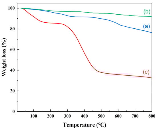 The thermal stability of the magnetic Cd(II) ion-imprinted material was studied with TGA in the range of 25 °C~800 °C at a heating rate of 10 °C min−1 under a nitrogen atmosphere. Fe3O4 (Figure 8a) and Fe3O4@SiO2 (Figure 8b) underwent a first drop at 150 °C, but it was not significant and probably due to the evaporation of water. Fe3O4 and Fe3O4@SiO2 demonstrated weight losses of 23.5% and 8.22%, respectively, as the temperature increased from 25 °C to 800 °C. This was attributed to the successful coating of SiO2 on the surface of the Fe3O4. The modification of SiO2 resulted in an improvement in the thermal stability of Fe3O4@SiO2. For Fe3O4@SiO2@IIP (Figure 8c), the first weight loss was about 17.1% and occurred as the temperature changed from room temperature to 150 °C; it was attributed to the loss of the adsorbed water in the polymers, which was not eliminated during the drying process. When the temperature increased from 150 to 260 °C, the thermal weight loss was minimal, indicating that the imprinted material could remain stable below 260 °C. However, the weight loss was significant in the temperature range from 260 to 480 °C at about 45.9%, which may have been due to the decomposition of the imprinted polymer layer on the surface of the Fe3O4@SiO2. The results showed that the prepared magnetic Cd(II) imprinted material had good thermal stability at temperatures below 260 °C.