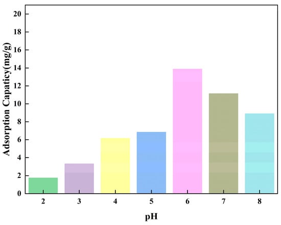 The pH of a solution has a significant impact on the adsorption of metal ions as it affects both the morphology of the ions in the aqueous solution and the charge distribution on the surface of the adsorbent material []. Given that Cd(II) ions hydrolyze when pH > 8.0, the effects of different pH values on the adsorption properties of Cd(II) were studied at room temperature under the conditions of a Cd(II) concentration of 50 mg·L−1 and pH values in the range of 2.0–8.0. The results are shown in Figure 9. The adsorption capacity of the Fe3O4@SiO2@IIP for Cd(II) increased gradually with the increase in solution pH and reached the maximum value of 13.88 mg·g−1 at the solution pH = 6.0. This may have been due to the high protonation of the imprinted polymer surface groups in the form of -COOH at low pH conditions, which caused severe repulsion from Cd(II) in solution. As the pH rose, the degree of protonation on the adsorbent surface gradually decreased, making it easier for Cd(II) ions to bind with carboxyl and phosphate groups on the surface of the adsorbent, thereby enhancing the chelation of Cd(II). When pH > 6.0, the adsorption capacity decreased with the increasing pH. This may have been due to the fact that it was Cd(II) that was hydrolyzed and precipitated, and some of the Cd(II) in the system was hydrolyzed to Cd(OH)+, reducing the repulsive forces between them and resulting in a lower concentration of free Cd(II) and, thus, lower adsorption [,]. Therefore, a pH value of 6.0 in aqueous solution was selected as the optimal pH for the subsequent experiments.