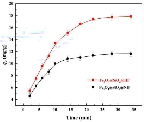 The adsorption kinetics for Cd(II) were assessed by measuring the adsorption equilibrium time for the adsorbent under conditions of an initial Cd(II) concentration of 50 mg·L−1, pH = 6.0, and a temperature of 25 °C. As shown in Figure 10, Fe3O4@SiO2@NIP obtained adsorption equilibrium faster than Fe3O4@SiO2@IIP but with a reduced adsorption capacity. Fe3O4@SiO2@NIP had a lower uptake rate due to the smaller surface area and reached equilibrium earlier compared to Fe3O4@SiO2@IIP. Owing to the presence of template Cd(II) ions, Fe3O4@SiO2@IIP had more adsorption sites than Fe3O4@SiO2@NIP, resulting in a higher adsorption capacity (18.21 mg·g−1) and a longer time (22 min) being required to reach adsorption saturation.