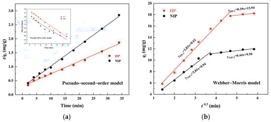 To further investigate the kinetics of the adsorption mechanism of the imprinted materials, pseudo–first–order kinetics (Equation (6)), pseudo–second–order kinetics (Equation (7)), and Weber–Morris kinetic models (Equation (8)) were used for linear fitting of the data []: