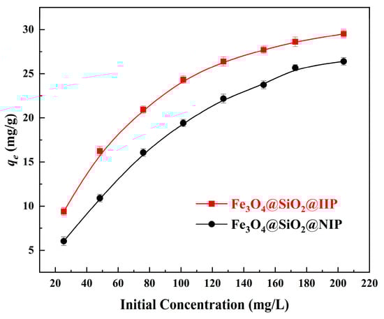 Figure 12 shows the room temperature Cd(II) sorption isotherms for Fe3O4@SiO2@IIP and Fe3O4@SiO2@NIP (at 25 °C and pH = 6.0 with initial Cd(II) concentration in the range of 25–205 mg·L−1). At the corresponding initial concentrations, the adsorption capacity of Fe3O4@SiO2@NIP was clearly lower than that of Fe3O4@SiO2@IIP. This can be explained by the specific effect: the specific adsorption sites present on the surface of Fe3O4@SiO2@IIP were complementary to the template in terms of size and coordination geometries, which was favorable for the binding of Cd(II) with the recognition sites.