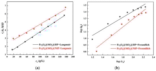 Isotherm model fitting curves for Fe3O4@SiO2@IIP and Fe3O4@SiO2@NIP. (a) Langmuir model and (b) Freundlich model.