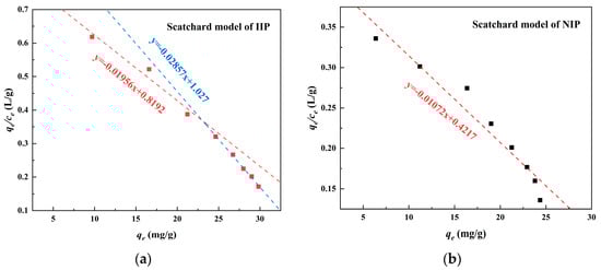 The Langmuir isotherm model, Freundlich isotherm model, and Scatchard model were fitted to the data to further investigate the adsorption mechanism of the adsorbent. The equations for the models are shown in Equations (9)–(11) []: