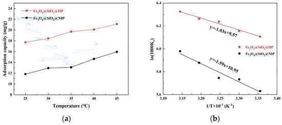 The effect of temperature on the adsorption equilibrium of Cd(II) for Fe3O4@SiO2@IIP and Fe3O4@SiO2@NIP (solution pH = 6.0, initial Cd(II) concentration of 50 mg·L−1, and temperature range of 25 °C–45 °C) was also investigated. Figure 15 shows the influence curve for temperature in relation to the adsorption capacity. The results showed that an increase in temperature was favorable for Cd(II) adsorption. Higher temperatures may increase the adsorbent pore size, allowing more Cd(II) to diffuse into the adsorbent. Furthermore, higher temperatures are more conducive to the diffusion of Cd(II) into the adsorbent system and its binding to the binding sites on the adsorbent surface.