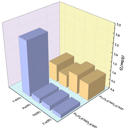 In order to evaluate the selectivity of Fe3O4@SiO2@IIP and Fe3O4@SiO2@NIP for Cd(II), Zn(II), Ni(II), and Co(II) were selected as competing ions for selective adsorption experiments, and the results are shown in Figure 16 and Table 6. It can be seen that the adsorption selectivity of Fe3O4@SiO2@IIP for Cd(II) was much higher than that of the other metal ions, with a DCd(II) of 643.30 mL·g−1 and a kCd(II)/Co(II) of up to 16.58 for Fe3O4@SiO2@IIP. However, the DCd(II) value for Fe3O4@SiO2@NIP was smaller than those of DNi(II) and DCo(II). This indicated that the phosphonate and carboxyl groups in the functional monomers had their own affinities, and the order of affinity for these ions was: Ni(II) > Co(II) > Cd(II) > Zn(II).