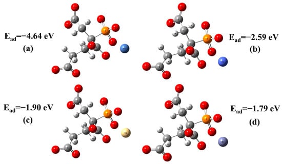 To explore the mechanism underlying this high selectivity, the binding energy of Cd(II) and other metals to PBTCA was calculated with the DFT method. As shown in Figure 17, the descending order of the binding energies of PBTCA with these metal ions was Ni(II), Co(II), Cd(II), and Zn(II), and the calculated results were consistent with the selective adsorption capacity of Fe3O4@SiO2@NIP. The results showed that Fe3O4@SiO2@IIP was made specific by the imprinting technology, and this specificity dominated the selective adsorption of Cd(II) from other interfering metal ions.