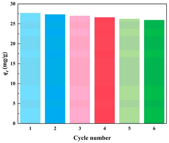 To investigate the stability and reusability of Fe3O4@SiO2@IIP, six adsorption–desorption experiments were carried out with 50 mg·L−1 Cd(II) solution using 2 mg·L−1 HCl aqueous solution as eluent, as shown in Figure 18. Compared to the initial cycle, the adsorption capacity of Fe3O4@SiO2@IIP only decreased by 7.32% for Cd(II), revealing the good regeneration capacity of Fe3O4@SiO2@IIP.