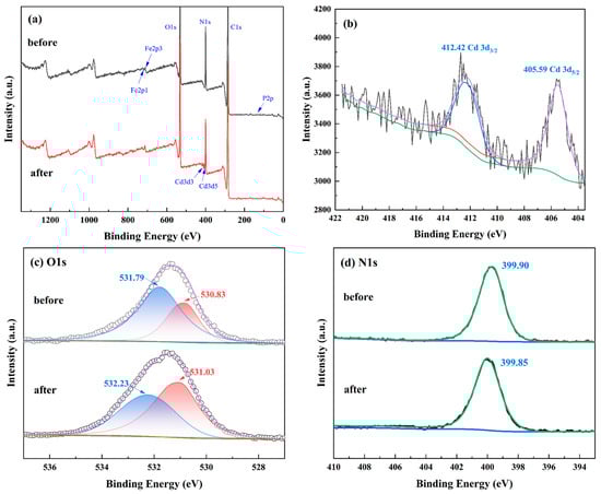 XPS analysis was carried out before and after the adsorption of Cd(II) by the imprinted polymer to further investigate the mechanism of adsorption of Cd(II) on Fe3O4@SiO2@IIP, and the XPS spectrum of the imprinted polymer after Cd(II) adsorption is shown in Figure 19a. The new characteristic peaks at 412.42 and 405.09 eV in the survey spectra were attributed to Cd 3d3/2 and Cd 3d5/2, respectively. The high-resolution XPS spectrum of Cd(II) is shown in Figure 19b, further indicating the imprinted polymer’s adsorption capacity for Cd(II). Deconvolution analysis of the O1s and N1s spectra was performed to examine the interactions between Cd(II) and the functional groups on Fe3O4@SiO2@IIP. Before Cd(II) adsorption, the O1s spectrum (Figure 19c) could be deconvoluted into two individual peaks with binding energies of 531.79 and 530.83 eV, which were ascribed to O atoms of the -COOH and -PO3H2 groups in the functional monomer PBTCA, respectively []. After Cd(II) adsorption, the O1s peaks shifted to higher binding energies of 532.23 and 531.03 eV, respectively. These shifts were caused by the empty orbitals of the cadmium atom sharing the electron cloud of the oxygen atom []. However, as shown in Figure 19d, the change in the binding energy of N1s was significantly less than 0.2 eV when Fe3O4@SiO2@IIP adsorbed Cd(II); therefore, the N atom was considered not to be involved in coordination. The results showed that the O atoms of the carboxylic acid groups and the phosphonic acid groups in PBTCA play a critical role in the high capture capacity for Cd(II).