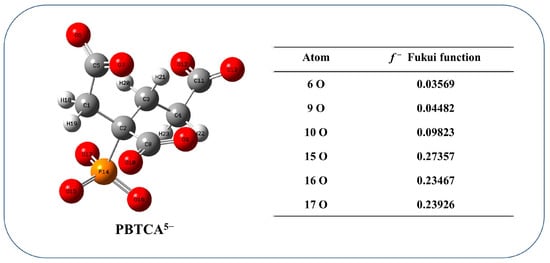 The Fukui function calculated with DFT was used for further verification of the chelating sites of the PBTCA5− molecule. Figure 20 shows the geometry optimization of PBTCA5− and the Fukui functions (f−) of atoms on potential adsorption sites in PBTCA5−.