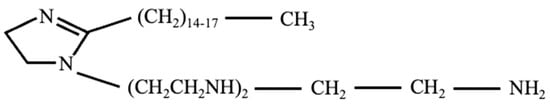 Electrochemical experiments were carried out using a traditional three-electrode vertical cell. An area of 1 cm2 (face up) was exposed in the cell. A platinum plate was used as the counter electrode, and a saturated calomel electrode (SCE) served as the reference electrode. Electrochemical characterization was carried out using a Corrtest 310H (Wuhan, China) potentiostat in 3.5 wt. % NaCl solutions with additions of self-synthesized ID (the structure was shown in Figure 1) yielding a concentration ranging from 200 ppm to 1000 ppm. The pH of the solutions was adjusted to pH 3.0 using concentrated HCl. ID was synthesized under 145 °C conditions, with copper sulfate being employed as the catalyst and the solvent being cyclohexane.