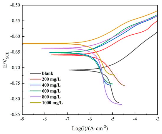 The representative results of the potentiodynamic polarization curves of Q235 after 24 h immersion in different concentrations of ID are shown in Figure 2, including the scans resulting from curves collected without the addition of inhibitor (denoted as blank in Figure 2). All of the polarization curves obtained in ID-bearing solutions exhibited a shift to lower current densities and an increase in the open circuit potential (OCP), indicating a good corrosion inhibition on carbon steel. The increase in OCP may be attributed to the film covering on the sample surfaces [25].