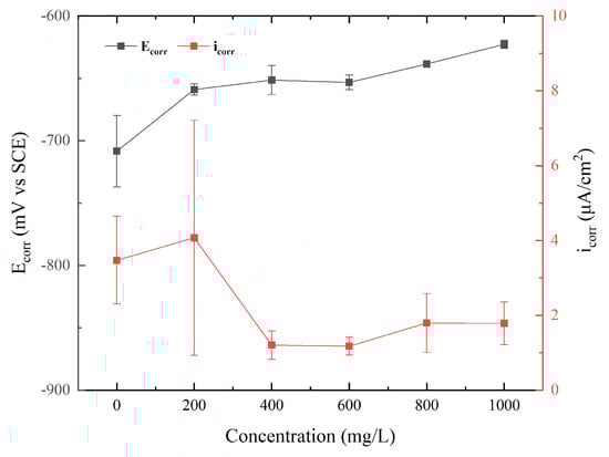 The concentration dependence of corrosion current density and corrosion potential values obtained from potentiodynamic polarization.