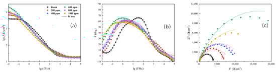 Bode plots (a,b) and Nyquist plot (c) results of various concentrations of ID in acid 3.5 wt. % NaCl solution after immersion for 24 h.