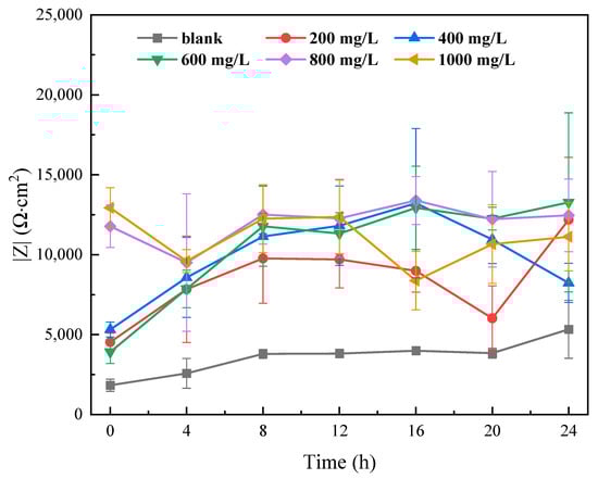 The inhibitor protection effect can be estimated with the value of Rp. To facilitate comparison, the dependence of Rp measured by EIS on ID concentrations was shown in Figure 6. The addition of ID increased the anti-corrosion performance of Q235, as evidenced by the increase in Rp. From 200 ppm to 1000 ppm, the overall performance of 200 ppm was the worst. The relatively low inhibitor concentration (200 ppm) was not able to provide good protection and was caused by an insufficient covering on the sample surface. However, an exceedingly high concentration of corrosion inhibitor (1000 ppm) was not providing desirable protection, which was caused by the steric hindrance effect. Scenarios of 600 ppm and 800 ppm had a similar trend within 24 h of EIS monitoring, with 600 ppm showing a higher Rp value after 24 h immersion. The EIS results had a good match with the potentiodynamic polarization test, which all indicated 600 ppm was the best concentration.