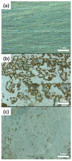 The optical micrographs obtained from the surface of Q235: without immersion test (a); after immersion in pH 3 NaCl solutions for 24 h (b); after immersion in pH 3 NaCl solution with 600 ppm ID (c). All samples were ultrasonically cleaned before testing.