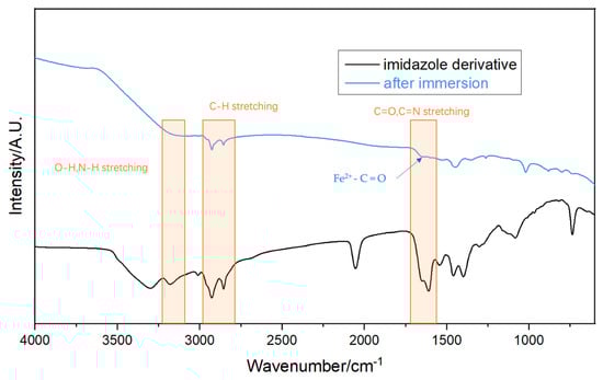 To study the protection mechanism of self-synthesized ID on Q235, the FT-IR test was employed (Figure 9). The bands between 2800 cm−1 and 2938 cm−1 correspond to symmetric stretching vibrations of C-H. From 3100 to 32,500 cm−1, the bands may be attributed to the O-H and N-H stretching vibration. The stretching vibration of C=O and C=N is located around 1730 cm−1 [35]. After immersion in pH 3 NaCl solution with 600 ppm ID, the surface of Q235 was measured with FT-IR. Many bands had a good match with ID. The protective film consists of Fe2+–C=O group and N–H stretch on the metal surface, indicating the adsorption of ID [36]. The FTIR spectra study reveals that the protective film on Q235 was caused by the adsorption of ID. Since the metal surface was occupied with ID, the intrusion of Cl−, O2, and H2O was inhibited [11]. Hence, the Q235 substrate was well-protected with excellent corrosion resistance. The ID inhibitor formed a protective layer on the surface of Q235 carbon steel, effectively preventing the intrusion of corrosive species such as Cl−, O2, and H2O to the metal surface. The main protection mechanism was attributed to its adsorption onto the metal surface, leading to the formation of a stable protective layer.