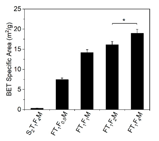 Specific surface area of the FTFM samples. Reaction time: 4 h. “*” is error bar.