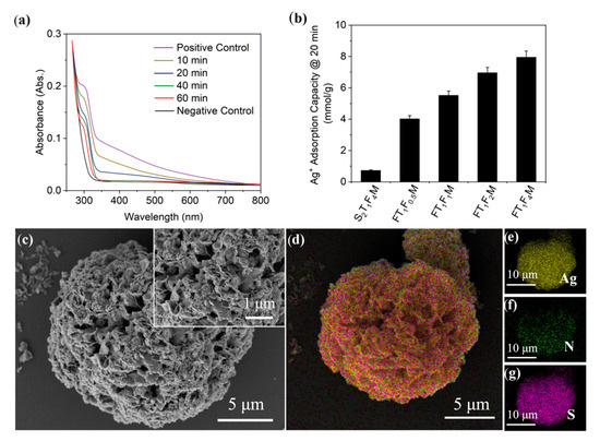 Evaluation of silver ion adsorption capacity: (a) the UV-vis spectrum of FT1F4M in 0.1mol/L AgNO3 solution with different adsorption time; (b) the silver ion adsorption capacity of FTFM with different formulations after 20 min adsorption in 0.1mol/L AgNO3 solution; (c) the SEM morphology of FT1F4M after 20 min adsorption in AgNO3 solution; (d) the EDS of FT1F4M after the adsorption; (e) Ag distribution on FT1F4M after the adsorption; (f) N distribution on FT1F4M after the adsorption; and (g) S distribution on FT1F4M after the adsorption.