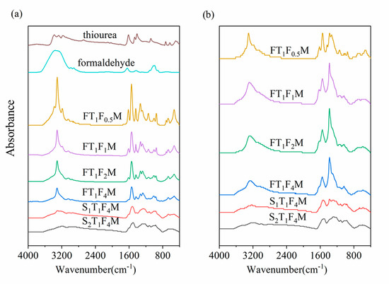 The chemical structure of the FTFM before and after the adsorption was further verified by the FTIR, and the corresponding spectrum was plotted in Figure 5. The peaks located at 3311 and 1541 cm−1 were assigned to the N-H stretching and bending vibrations, respectively, which were greatly weakened after the thiourea–formaldehyde resin was formed. Additionally, this trend became more prominent when the molar ratio between thiourea and formaldehyde increased from 1:0.5 to 1:4 as more N-H was replaced by N-C. Correspondingly, the peaks located at 1327 cm−1 representing the N-C connection kept increasing during this process. The peaks caused by the vibration of N-H became wide and unsignificant for the solid microspheres (S2T1F4M) quenched by ammonia chloride. Figure 5b demonstrates the FTIR spectrum of the FTFM samples after 20 min adsorption at 0.1 mol/L AgNO3 solution under room temperature. The peaks located around 1403 cm−1 were assigned to C=S from the thiourea and were greatly reduced after the absorption in the AgNO3 solution, which was supposed to be caused by the chelation between C=S and silver ions. The peaks located around 3311 and 1541 cm−1 were broadened and weakened after adsorption, indicating the chelation between silver ions and N-H during the adsorption. The change of C=S structure of the solid microspheres (S2T1F4M) was hardly observed from the FTIR spectrum; however, the reduction in the peak around 1541 cm−1 indicated the chelation between silver ions and N-H on the surface of the solid microspheres. The FTIR spectrum confirmed the Mannich reaction between formaldehyde and thiourea and the chemical structure evolution of different formulations. Additionally, the chelation of NH-Ag+ and C=S-Ag+ was confirmed for all flower-like microspheres.