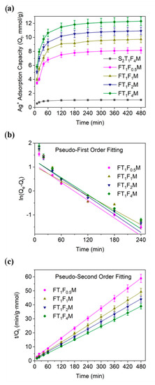 The FTFM adsorbent (0.1 g) was added to 25 mL of 0.1 mol/L AgNO3 solution (pH = 6.0) in a centrifuge tube, and adsorption was allowed to occur for 10–480 min. Samples of 5 mL solution were withdrawn at scheduled time intervals and analyzed for silver ion concentration. Based on Brandani’s research on adsorption kinetics [30], the obtained data were fitted to pseudo-first-order (PFO) [31] and pseudo-second-order (PSO) [32] models.