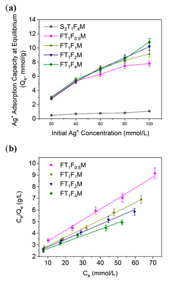 At the optimal pH of 6.0, a solution of silver ion (25 mL, 20–100 mmol/L) and FTFM (0.1 g) were placed in a centrifuge tube. The obtained data were fitted to the Langmuir model. The Langmuir model assumes that the adsorption process occurs in a single layer on a homogeneous medium [33].