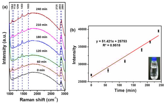 (a) SERS spectra of PE particles released from bottled mineral water after four irradiation times: 0, 60, 120, 180, 210 and 240 min. (b) Linear regression of the peak absorption band at 2895 cm−1 versus time over the full 240 min experiment. Each spectrum was determined three times. Reprinted with permission from [130].