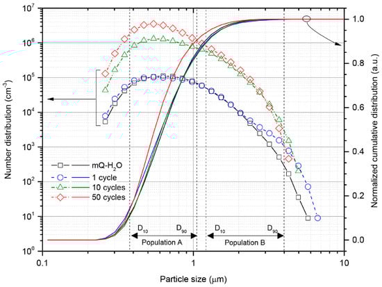 SPES histograms performed for measuring the size of NPs released from three opening–closing cycles—1, 10, and 50 times—at a volume of 15 ± 0.3 mL per sample. Dotted lines are the boundaries of population A and B particle size distributions indicated in terms D10 and D90as calculated from SPES histograms [123].