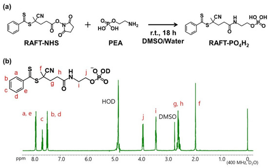 (a) Synthetic scheme of RAFT-PO4H2. (b) 1H NMR spectrum and corresponding chemical structure of RAFT-PO4H2.