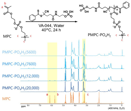 Top: Scheme of RAFT polymerization of MPC with RAFT-PO4H2. Bottom: 1H NMR spectra of MPC and polymer solutions obtained after RAFT polymerizations of MPC using RAFT-PO4H2 with different molar ratios of MPC and RAFT-PO4H2.
