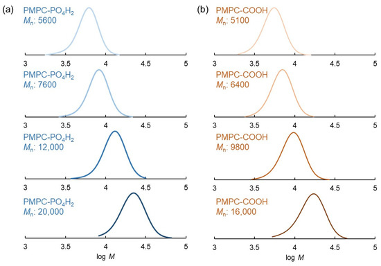 The polymerization control capability of RAFT-PO4H2 as a control agent was investigated via RAFT polymerization of MPC by comparing the performance of RAFT-COOH. In the experiments, the target molecular weights of PMPC were regulated by changing the feed molar ratio of MPC to RAFT-PO4H2, where the feed molar ratio [MPC]/[RAFT-PO4H2] was set to 10, 20, 40, and 80. Deionized water was selected as the solvent for polymerization. The monomer conversions in all polymerizations using RAFT-PO4H2 were estimated to be approximately 99% by 1H-NMR (Figure 2). The number-average molecular weights (Mn) of PMPC prepared using RAFT-PO4H2 (PMPC-PO4H2) were evaluated to be approximately 5600 (Mw/Mn:1.10), 7600 (Mw/Mn:1.11), 12,000 (Mw/Mn:1.12), and 20,000 (Mw/Mn:1.15) by gel permeation chromatography (GPC) when the target molecular weights were set to 3400, 6300, 12,200, and 24,000, respectively (Table 1). The difference between the experimental and theoretical Mn values was caused by the difference in the excluded volume of the polymer chains between PMPC and PEG, which was used as a standard polymer for preparing a calibration curve for GPC measurements. Methanol was selected as the solvent for RAFT polymerization of MPC with RAFT-COOH because of the low solubility of RAFT-COOH. The conversion of RAFT polymerization of MPC reached 99% at all feed molar ratios of [MPC]/[RAFT-COOH] (see in Supplementary Materials Figure S3). The Mn of PMPC prepared using RAFT-COOH (PMPC-COOH) was evaluated to be approximately 5100 (Mw/Mn:1.11), 6400 (Mw/Mn:1.11), 9800 (Mw/Mn:1.16), and 16,000 (Mw/Mn:1.21) when the target molecular weights were 3200, 6200, 12,100, and 24,000, respectively (Figure 3, Table 1). These results indicate that PMPC-PO4H2 and PMPC-COOH were successfully prepared with narrow molecular weight distributions using RAFT-PO4H2 and RAFT-COOH, respectively. Furthermore, PMPC-PO4H2 and PMPC-COOH showed absorbances at 491 nm and 488 nm, respectively, which were derived from the dithiobenzoate groups of the RAFT end groups (see in Supplementary Materials Figures S4 and S5).