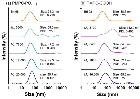 Particle size distributions of PMPC-PO4H2- (a) and PMPC-COOH- (b) modified TiO2 nanoparticles. PMPC-PO4H2 (a) and PMPC-COOH (b) possessing different molecular weights were obtained after RAFT polymerizations of MPC using RAFT-PO4H2 and RAFT-COOH, respectively.