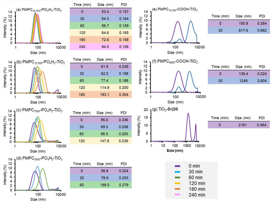 Particle size distributions, average particle size, and PDI values of PMPC-modified TiO2 nanoparticles prepared with PMPC20,000-PO4H2 (a), PMPC12,000-PO4H2 (b), PMPC7600-PO4H2 (c), PMPC5600-PO4H2 (d), PMPC30,000-COOH (e), PMPC15,000-COOH (f), and Brij98-stabilized TiO2 nanoparticles (g) at different incubation times (0 min: purple, 30 min: blue, 60 min: green, 120 min: yellow, 180 min: orange, 240 min: pink) in PBS.