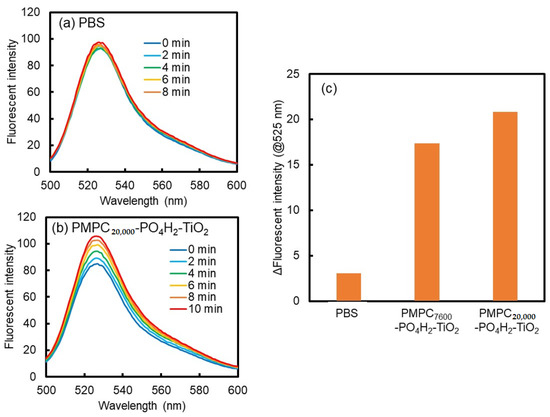 Finally, we investigated the 1O2 generation capability of PMPC20,000-PO4H2-modified TiO2 particles under sonication in PBS using singlet oxygen sensor green (SOSG) as a probe molecule; the fluorescence intensity derived from SOSG increases upon reaction with 1O2. As shown in Figure 6, the fluorescence intensity of SOSG increased gradually with increasing sonication time and was significantly higher than that of the control sample in the absence of PMPC20,000-PO4H2-modified TiO2 particles (buffer solution). Furthermore, the fluorescence intensity derived from 1O2-reacted SOSG for PMPC20,000-PO4H2-modified TiO2 particles was higher than that for PMPC7600-PO4H2-modified TiO2 particles. These results indicate that the PMPC-PO4H2-modified TiO2 particles with high colloidal stability in the buffer solution exhibited 1O2 generation ability under sonication conditions in aqueous media.