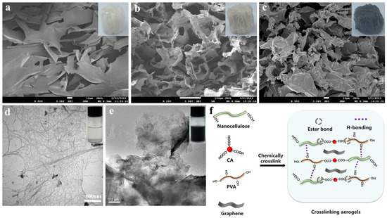 SEM images and digital pictures of (a) CA, (b) CPA, and (c) CPGA, respectively. TEM images and digital pictures of (d) TOC and (e) graphene, respectively. (f) Schematic illustration of the crosslinking mechanism of the CPGA.