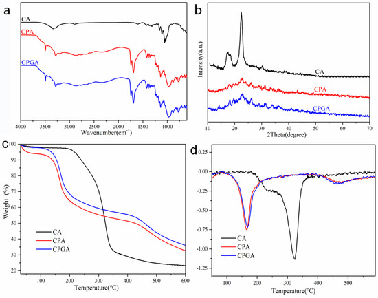 (a) FTIR spectra, (b) XRD patterns, (c) TGA, and (d) DTG curves of CA, CPA, and CPGA, respectively.
