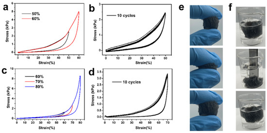 (a) Stress–strain curves of aerogel at 50% and 60%stains in the air. (b) Stress–strain curves of aerogel at 10th cycles at 50% strain in the air. (c) Stress–strain curves of aerogel under different stains under the water. (d) Stress–strain curves of aerogel at 10th cycles at 50% strain under the water. Photo of aerogel bouncing back under compression in air (e) and underwater (f), respectively.