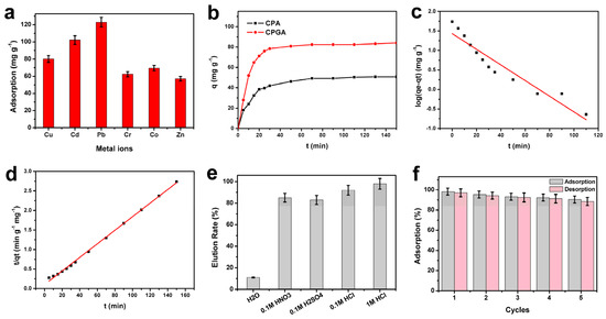 (a) Adsorption capacities of CPGA with various metal ions. (b) The adsorption efficiency as a function of contact time for CPA and CPGA. (c) Pseudo-first-order kinetics and pseudo-second-order kinetics (d) fit of Cu2+ adsorption on CPGA. (e) The elution efficiency of the CPGA. (f) The impact of recycling on adsorption capacity.