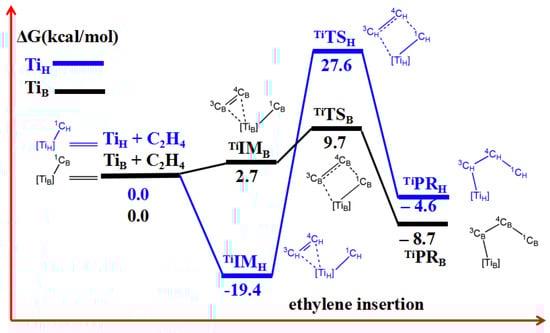 Reaction pathway of ethylene insertion into TiH (blue) or TiB (black) catalysts.
