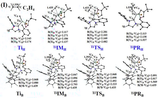 Figure 1 depicts the pathway of ethylene insertion to titanium (TiH or TiB) catalysts. The optimized structures and IRI analysis of key structures are shown in Figure 2. Table 1 presents the WBIs and natural charges (QNBO) for certain key bonds and atoms. Evidently, the ethylene insertion to titanium (TiH or TiB) catalysts initially formed an intermediate (TiIMH or TiIMB), followed by a four-member ring transition state (TiTSH or TiTSB), ultimately generating the final product (TiPRH or TiPRB). TiH and TiB are half-titanocene catalysts containing N-heterocyclic carbene as a ligand, with the difference that in TiB, one hydrogen of the N-heterocyclic carbene is substituted by B(C6F5)3 as the remote coordinating ligand.