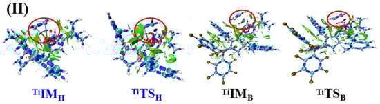 The EIM−dist and ETS−dist(eff) values of TiIMH and TiTSH were 30.2 and 75.8 kcal/mol, respectively, which are much higher than those of TiIMB (9.6 kcal/mol) and TiTSB (36.1 kcal/mol), respectively. This indicates that TiIMH and TiTSH undergo a more significant configuration change compared to reactants. This is consistent with the IRI analysis. Figure 2II shows the IRI analysis of TiIMH, TiTSH, TiIMB, and TiTSB []. Evidently, the interactions between the two reaction fragments (C2H4 and Ti catalyst) in TiIMH and TiTSH were stronger than those in TiIMB and TiTSB.
