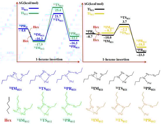 For TiH catalysts, two pathways exist for 1-hexene insertion reactions: 1,2 insertion (TiH12) or 2,1 insertion (TiH21). The free energies indicated that the TiH21 pathway is thermodynamically and kinetically preferred over the TiH12 pathway. Compared with the reactant (TiPRH + Hex), the free energy barrier of TiTSH21 was 26.3 kcal/mol, which is lower than the 30.0 kcal/mol barrier for the TiTSH12 catalyst. Furthermore, the reaction for the TiH21 pathway was exothermic by 11.7 kcal/mol, which is higher than the 7.5 kcal/mol for the TiH12 pathway.