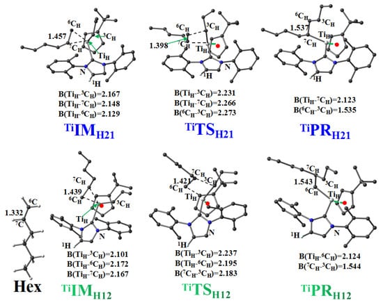 Optimized structures of the reaction pathway for 1-hexene insertion into Ti catalysts shown in Figure 3, with key bond lengths in angstroms. Most hydrogen atoms are omitted for clarity.